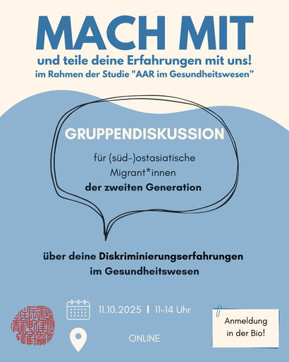 Die Diskussion findet im Rahmen unserer Studie „Gemeinsam gegen Vorurteile: Antiasiatischer Rassismus und Zugangsbarrieren zur Gesundheitsversorgung“ statt.