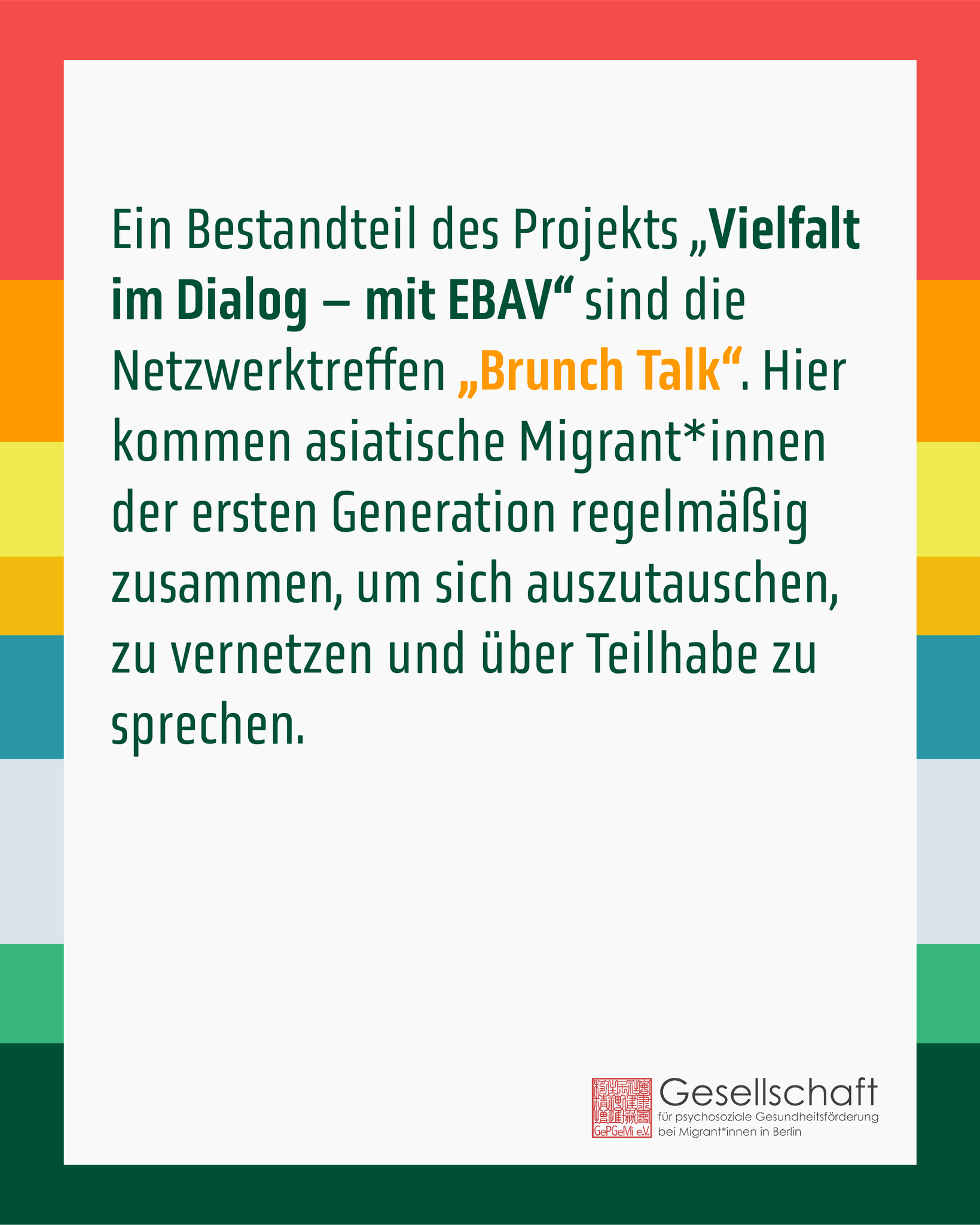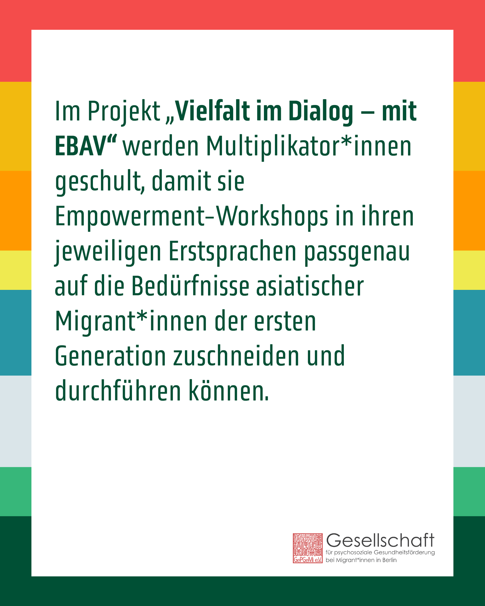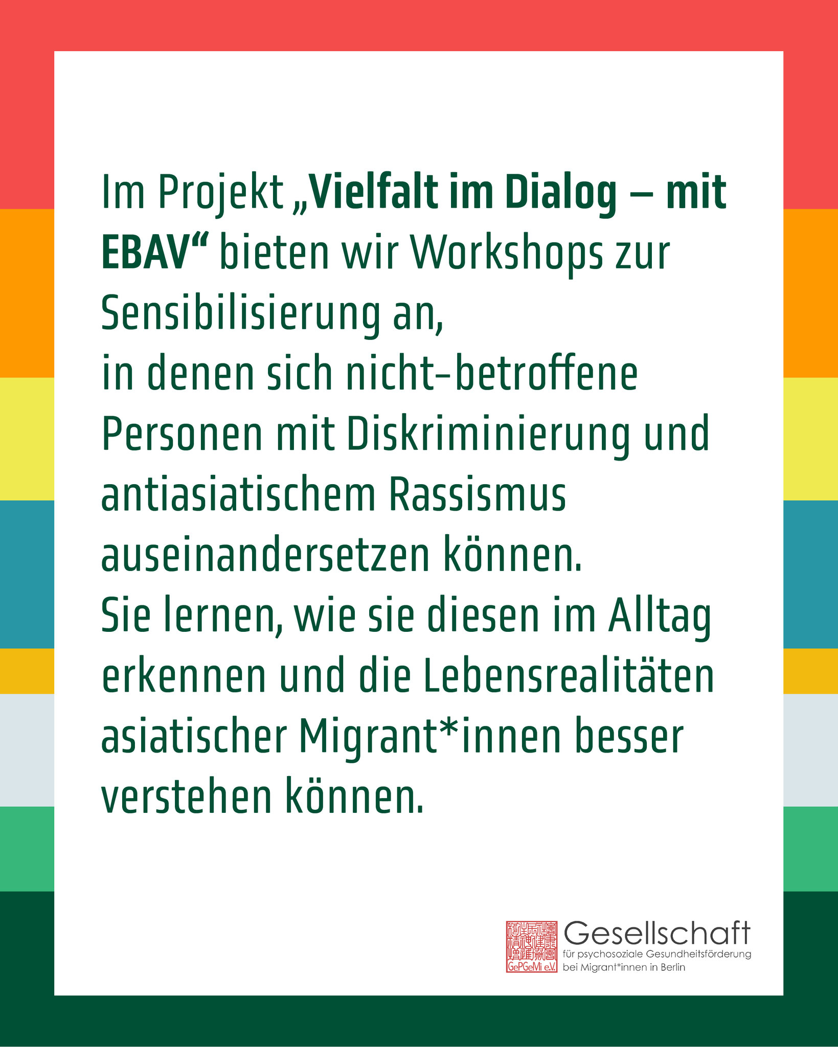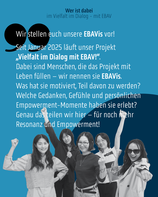 Das Projekt "Vielfalt im Dialog mit EBAV" wird als Innovationsprojekt im Rahmen des Bundesprogramms „Demokratie leben!“ des Bundesministeriums für Bildung, Familie, Senioren, Frauen und Jugend gefördert. Zudem wird es von der Berliner Senatsverwaltung für Arbeit, Soziales, Gleichstellung, Integration, Vielfalt und Antidiskriminierung im Rahmen von „Demokratie. Vielfalt. Respekt.“, dem Landesprogramm gegen Rechtsextremismus, Rassismus und Antisemitismus, kofinanziert.