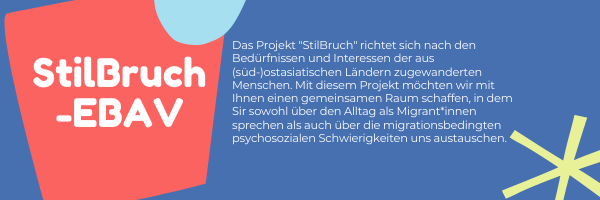 Das Projekt StilBruch-EBAV richtet sich nach den Bedürfnissen und Interessen der aus südost- sowie ostasiatischen Ländern zugewanderten Menschen. Mit diesem Projekt möchten wir mit Ihnen einen gemeinsamen Raum schaffen, in dem Sie sowohl über den Alltag als Migrant*innen sprechen als auch sich mit uns über die migrationsbedingten psychosozialen Schwierigkeiten austauschen.